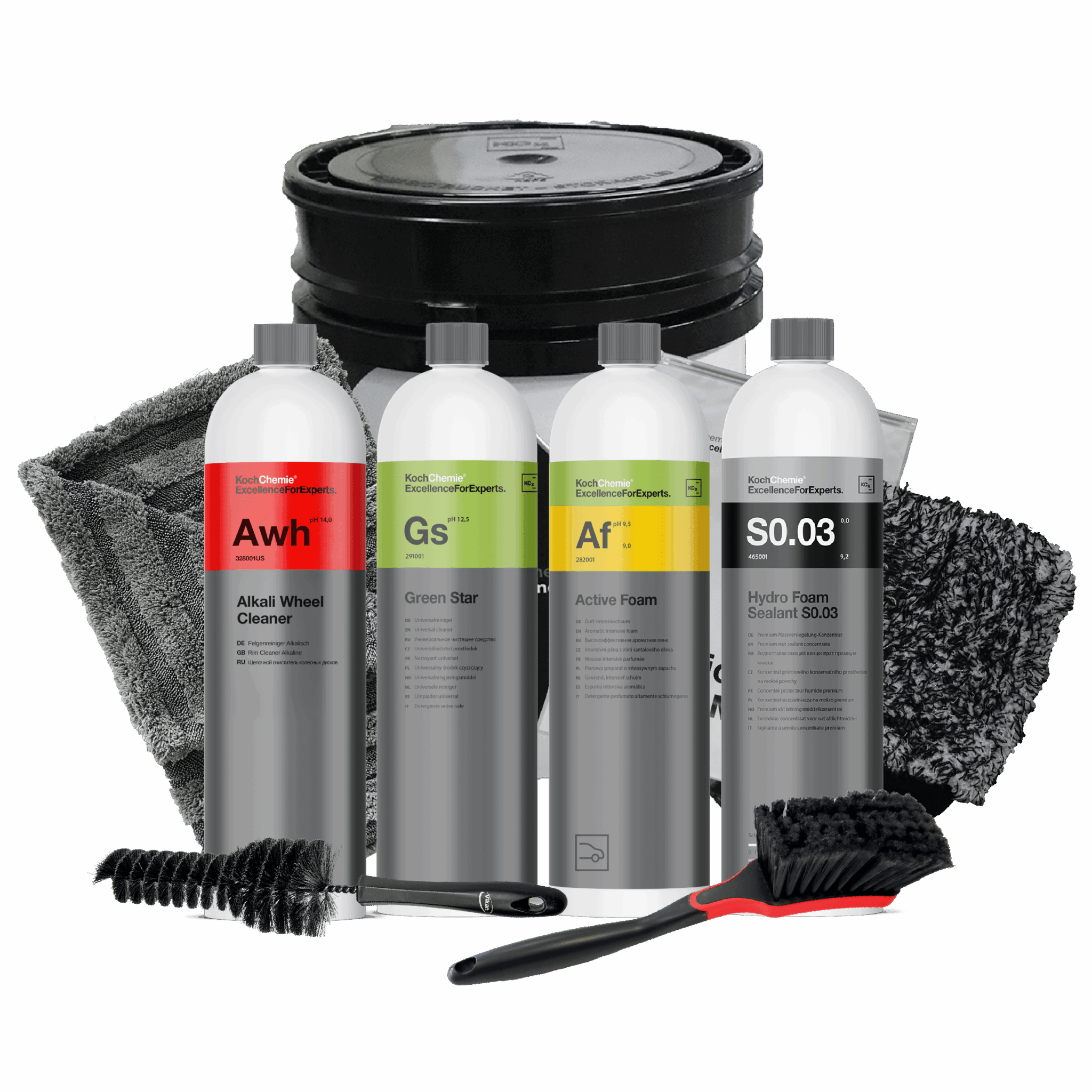 דלי + כפפת מיקרופייבר לחוץ הרכב קוך + מגבת ייבוש מקצוענית + מברשת ג׳אנטים קטנה + מברשת עגולה גדולה לג׳אנטים
